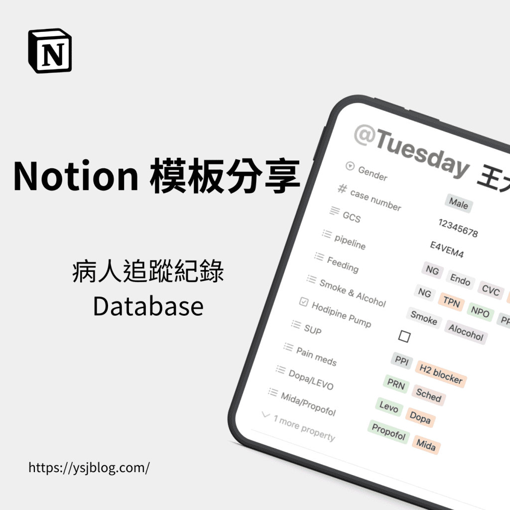 相信不管是在醫院實習或是工作都會遇到需要追蹤病人療程或進展的時候,然而如果沒有系統化的格式或是模板進行記錄的話,往往筆記到最後都會變得雜亂無章,或是很難追溯從前的紀錄。因此這次想要與大家分享我自己在醫院實習時參考藥師的紀錄表,建立的 Notion 病人追蹤模板,希望能夠幫助到有需要的人們。記得把文章看到最後才可以找到模板獲取方式!